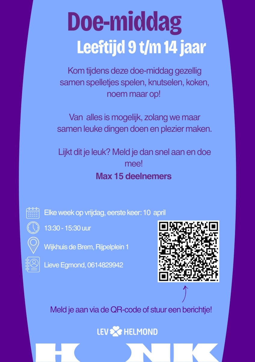 Ik organiseer een doe-middag in wijkhuis de Brem, iedere vrijdagmiddag van 13:30 - 15:30 vanaf 10 april. Leeftijd is vanaf 9 jaar (t/m 14 jaar).
